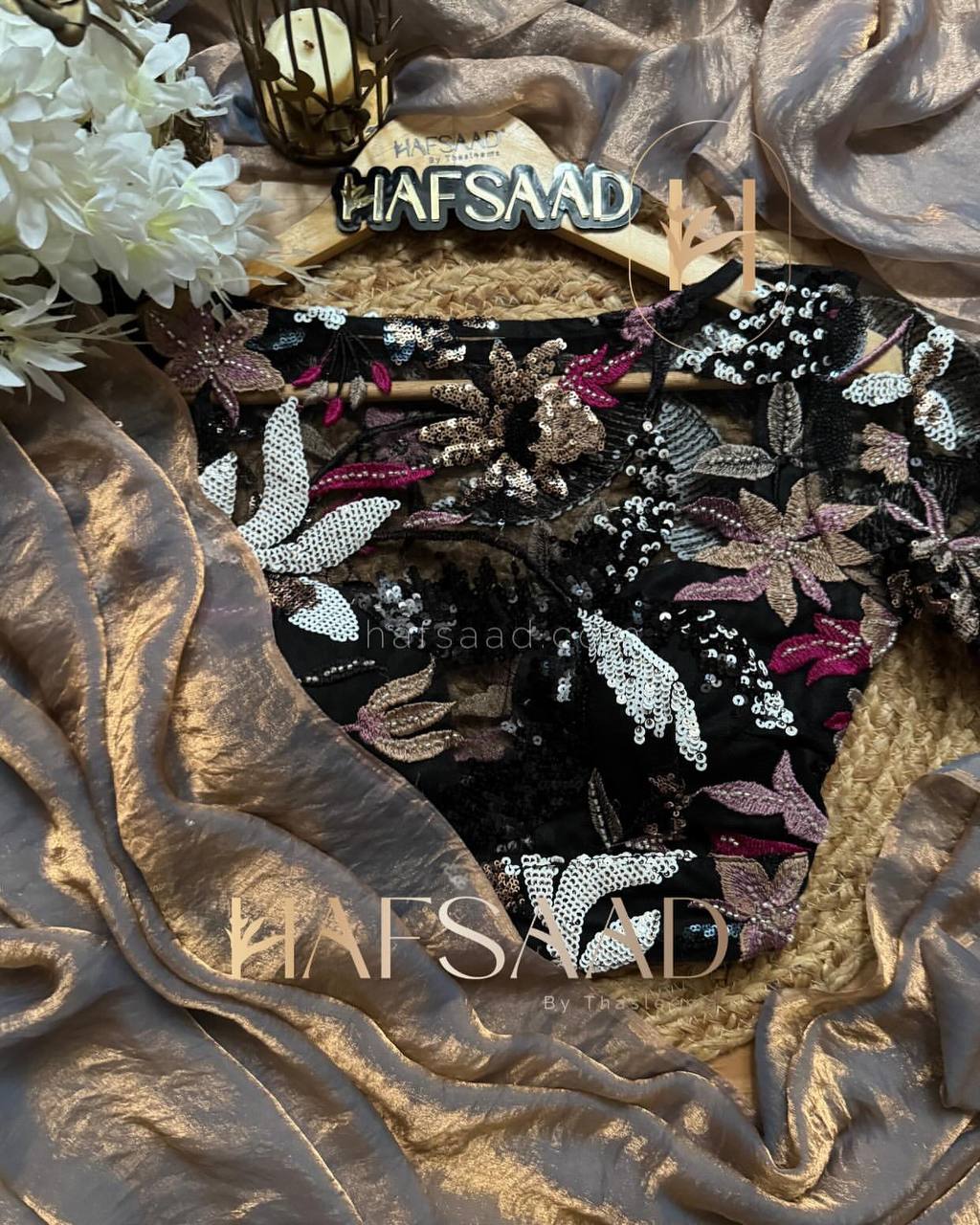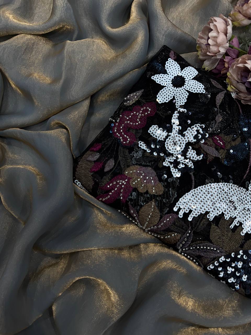 Women’s Luxurious Shimmering Grey Organza Saree with Intricately Embroidered Black Blouse – Perfect for Festive & Evening Wear