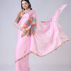 Women’s Pristine White Organza Saree with Exquisite Pink & Green Floral Thread Embroidery – Complete with Matching Embroidered Blouse for Festive & Summer Wear